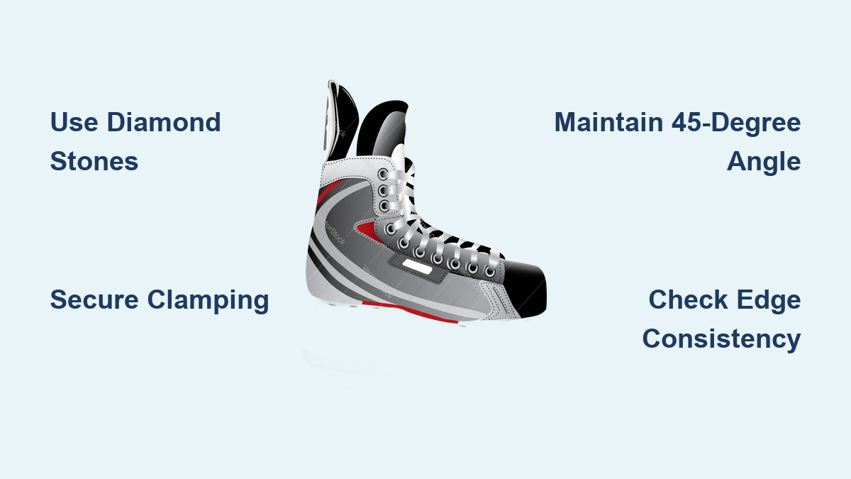 How to Sharpen Hockey Skates at Home Skate26, April 4, 2026 Tired of waiting in line at the pro shop only to find your skates don’t feel right on the ice? Learning how to sharpen hockey skates at home puts you in complete control of your blade’s performance while saving you hundreds of dollars annually. Most recreational hockey players pay $5-$10 per sharpening, meaning you’ll recoup your initial equipment investment after just 5-10 sessions. Beyond the financial benefits, home sharpening ensures consistent edge quality tailored precisely to your skating style and ice conditions. When you sharpen your own hockey skates, you eliminate the guesswork of communicating your preferred radius of hollow to a shop technician. You’ll develop a deeper understanding of blade maintenance that directly translates to better on-ice performance. This guide delivers everything you need to transform from a novice to a confident home skate sharpener—covering essential equipment, blade geometry fundamentals, step-by-step sharpening techniques, and critical mistakes to avoid. By the end, you’ll know exactly how to sharpen hockey skates at home to professional standards. Essential Tools for Home Skate Sharpening Success Skipping proper equipment guarantees frustration and inconsistent results. Invest in these specific tools before attempting your first sharpening session to ensure professional-quality edges every time. Diamond Stones and Precision Files for Perfect Edges Start with a dual-sided diamond stone (120/400 grit) as your foundational sharpening tool—these remove metal 3-5 times faster than traditional stones and maintain consistent performance throughout their lifespan. The coarse side (120 grit) reshapes damaged edges, while the fine side (400 grit) produces a razor-sharp finish. Store stones in a dry container with silica gel packets to prevent corrosion. Pair your stones with a 6-inch mill bastard file (100-150 grit) for major blade reshaping. Unlike stones, files quickly remove deep nicks and restore blade symmetry. Always file in one direction only—from heel to toe—applying moderate pressure. After each use, clean metal filings from the file teeth with a wire brush to maintain cutting efficiency. Secure Clamping Systems That Prevent Slippage Your skate must remain perfectly stationary during sharpening—any movement creates uneven edges that compromise your skating. Invest in an adjustable aluminum vise that clamps to your workbench, providing rock-solid stability without damaging your boot. Look for models with rubber padding to protect your skate’s blade holder. Position the vise at elbow height to maintain proper posture. Your arms should form 90-degree angles when working, preventing fatigue during longer sessions. Test the clamp by trying to wiggle the skate—if you detect any movement, tighten the vise further before proceeding. Critical Safety Gear You Can’t Skip Metal filings become dangerous projectiles during sharpening. Wear ANSI Z87.1-rated safety glasses with side shields and cut-resistant gloves to protect against flying debris and accidental blade contact. A magnetic parts tray positioned beneath your work area captures metal shavings for safe disposal. Never sharpen near children or pets. Designate a specific workspace in your garage or basement where you can control access during sharpening sessions. Keep a first-aid kit within arm’s reach containing antiseptic wipes and bandages rated for metal splinters. Mastering Blade Geometry for Optimal Ice Performance Understanding how radius of hollow affects your skating prevents wasted effort and delivers predictable results when you sharpen hockey skates at home. Choosing Your Perfect Radius of Hollow The radius of hollow (ROH) determines how deeply your edges bite into the ice. Competitive players typically prefer 3/8″ to 7/16″ for aggressive edge grip during quick turns, while recreational skaters often choose 1/2″ to 5/8″ for smoother glide with less effort. Measure your current hollow by placing a coin (dime = 7/16″, nickel = 1/2″) under your blade on a flat surface—if it fits snugly, that’s your ROH. Mark your preferred radius on the inside of your skate tongue with a permanent marker. This reference ensures consistent sharpening results session after session. Beginners should start with 1/2″ radius before experimenting with deeper hollows as their skills improve. Identifying Blade Wear Patterns Before Sharpening Examine your blade under bright LED lighting before sharpening. Run your finger perpendicular to the edge—you should feel consistent sharpness along the entire length. Common wear patterns include: Center wear: Creates a flat spot that reduces edge grip (requires more aggressive sharpening) Heel/toe wear: Causes unstable push-offs and landings Asymmetrical wear: One edge significantly duller than the other (indicates improper skating technique) Document wear patterns with photos to track changes between sharpenings. This visual record helps you adjust your sharpening technique and identify potential skating form issues. Step-by-Step Home Sharpening Technique Follow this proven process to achieve professional-quality edges without expensive machinery. Allow 25-30 minutes per skate for your first few attempts, reducing to 15-20 minutes with practice. Establishing a Consistent Baseline Edge Begin by cleaning blades with a wire brush to remove rust and debris. Clamp the skate securely in your vise with the blade fully exposed. Hold your 120-grit diamond stone at a consistent 45-degree angle to the blade edge. Make 15-20 smooth heel-to-toe strokes applying moderate pressure (about 2-3 pounds). Maintain identical stroke count and pressure on both sides of the blade. You’ll know you’ve established a proper edge when metal shavings form consistent ribbons rather than powdery residue. Pro Tip: Place masking tape along the blade holder to prevent accidental stone contact with plast